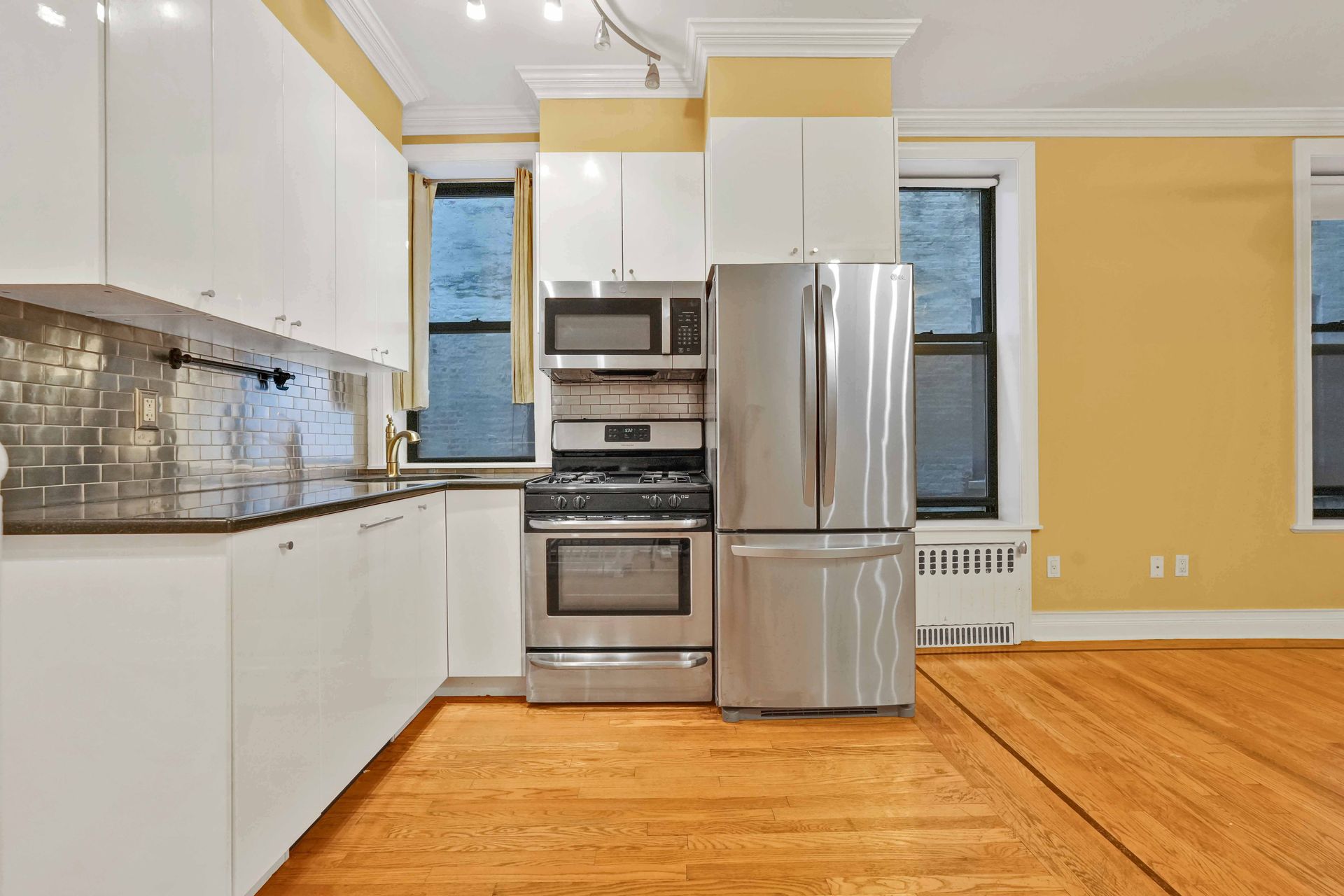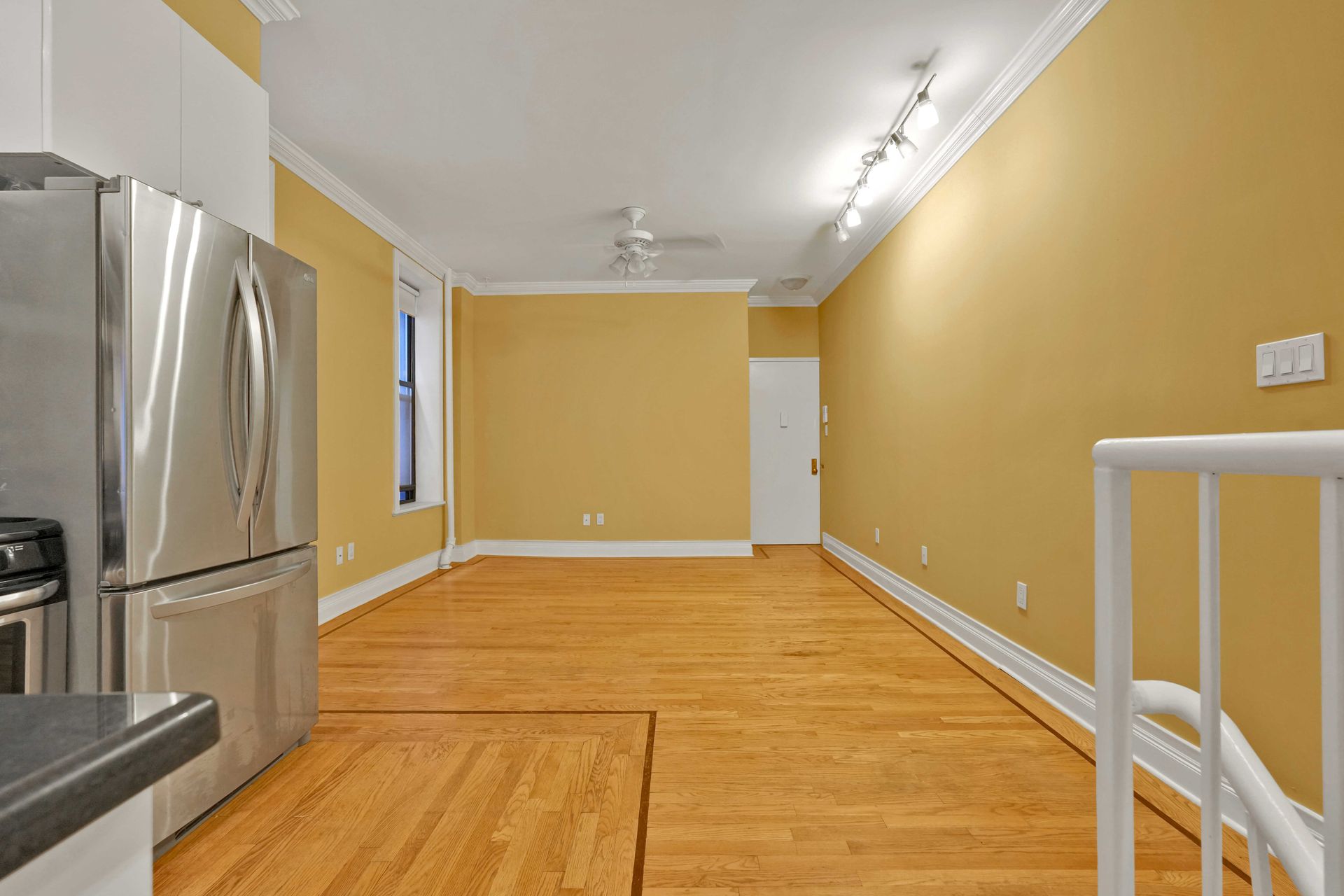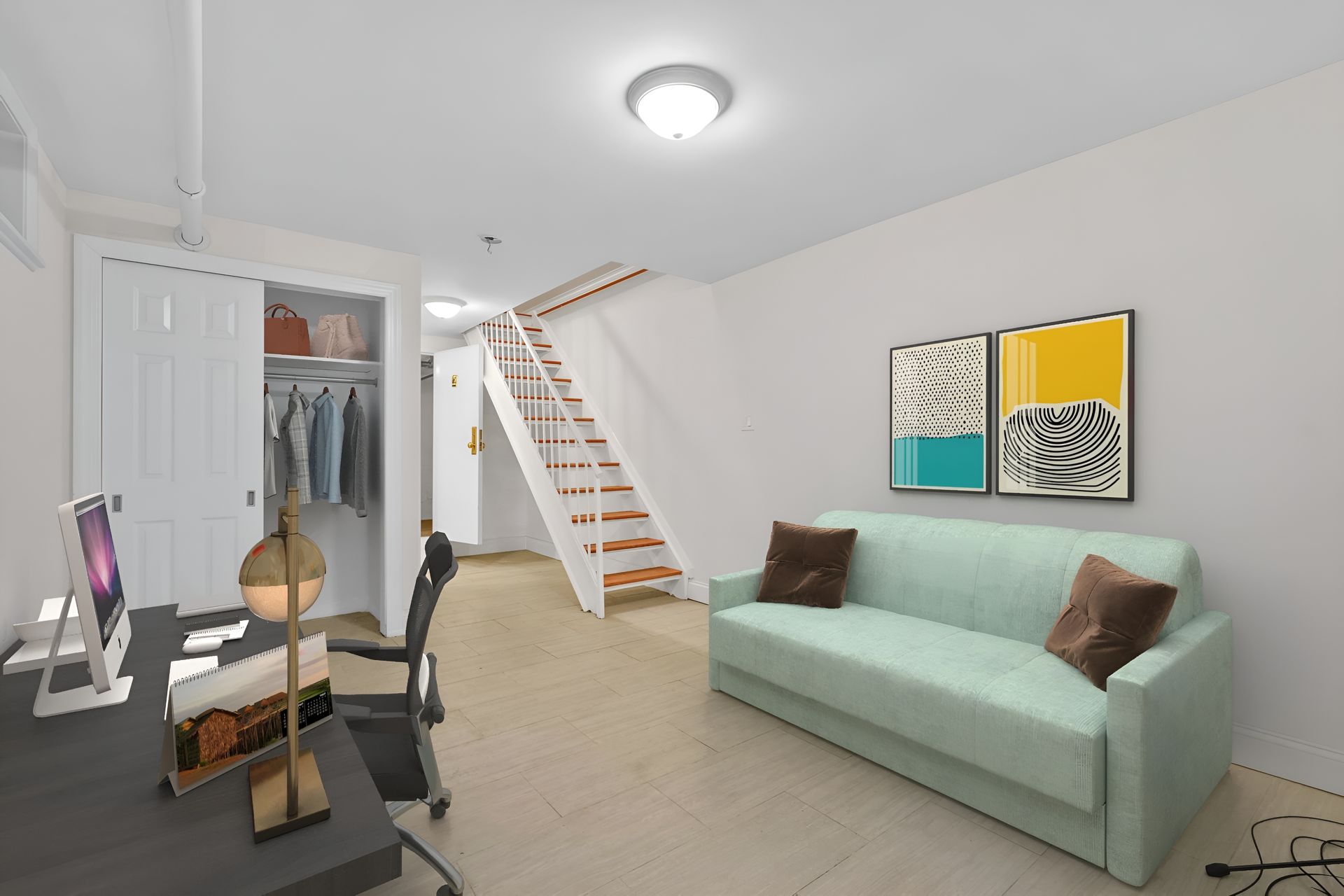 Residents enjoy access to a fitness center, bike storage, resident lounge, and package room, with convenient subway access just one block away.
