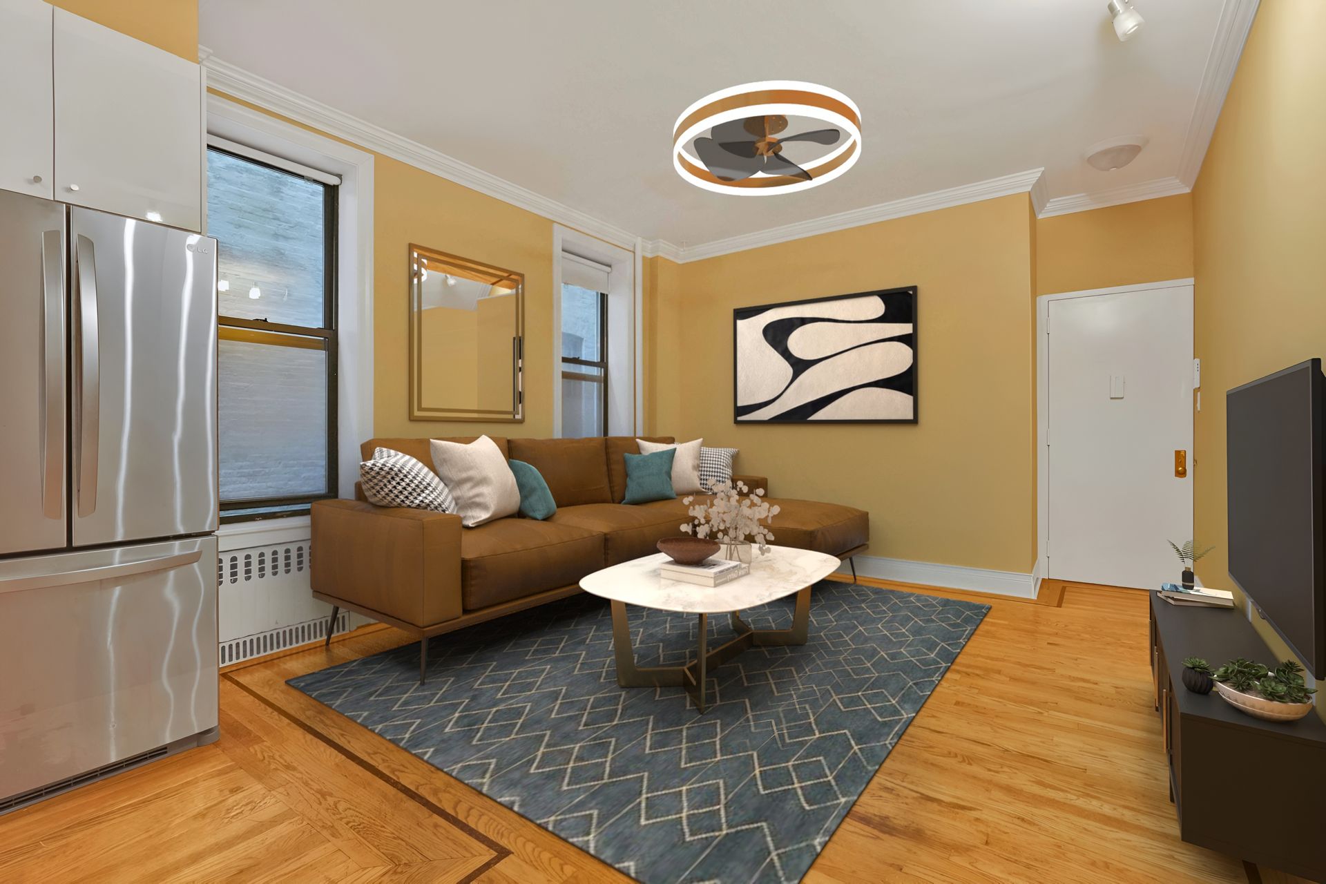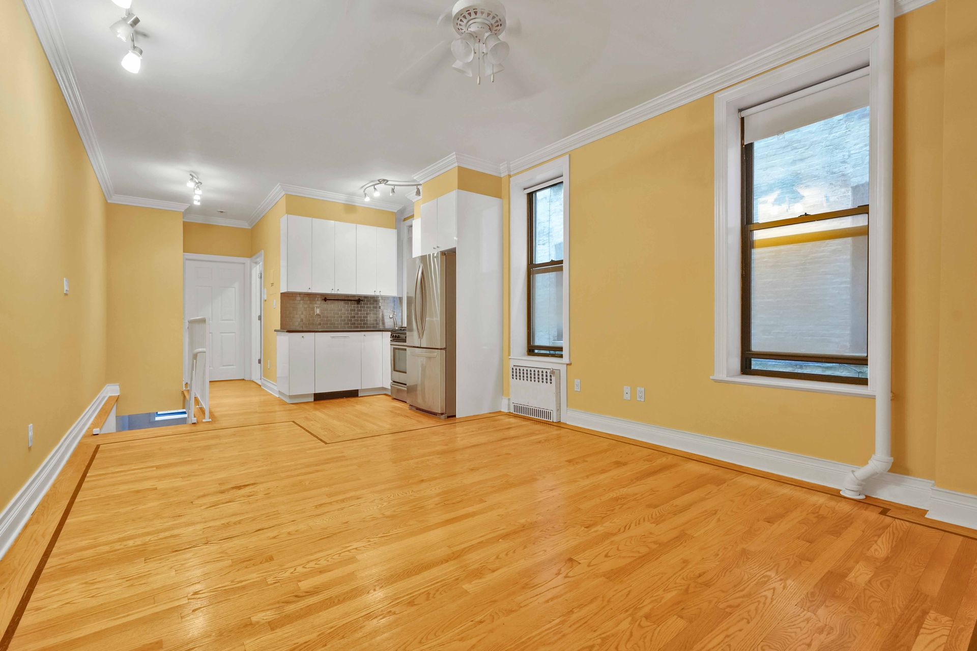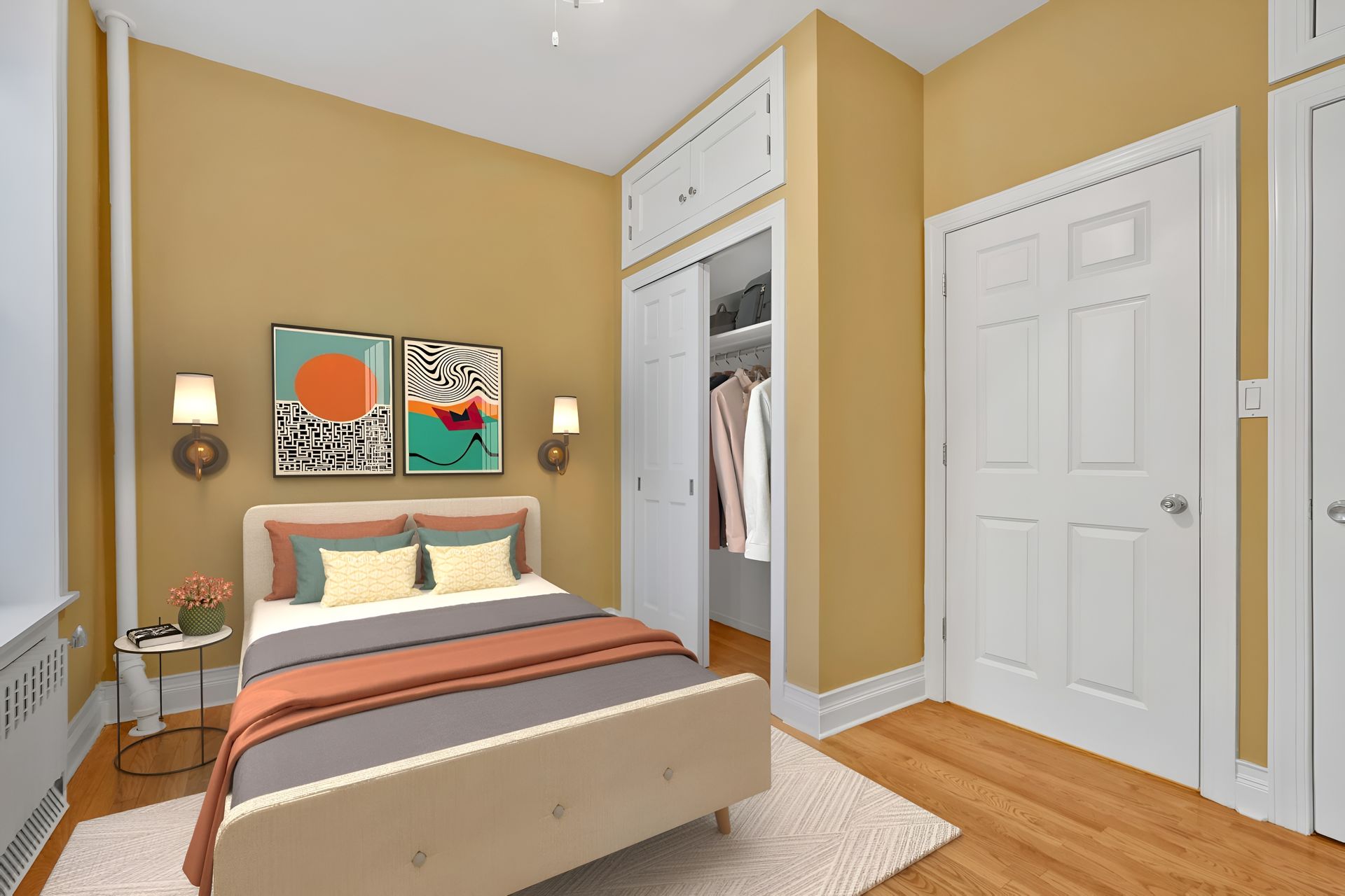 Residents enjoy access to a fitness center, bike storage, resident lounge, and package room, with convenient subway access just one block away.