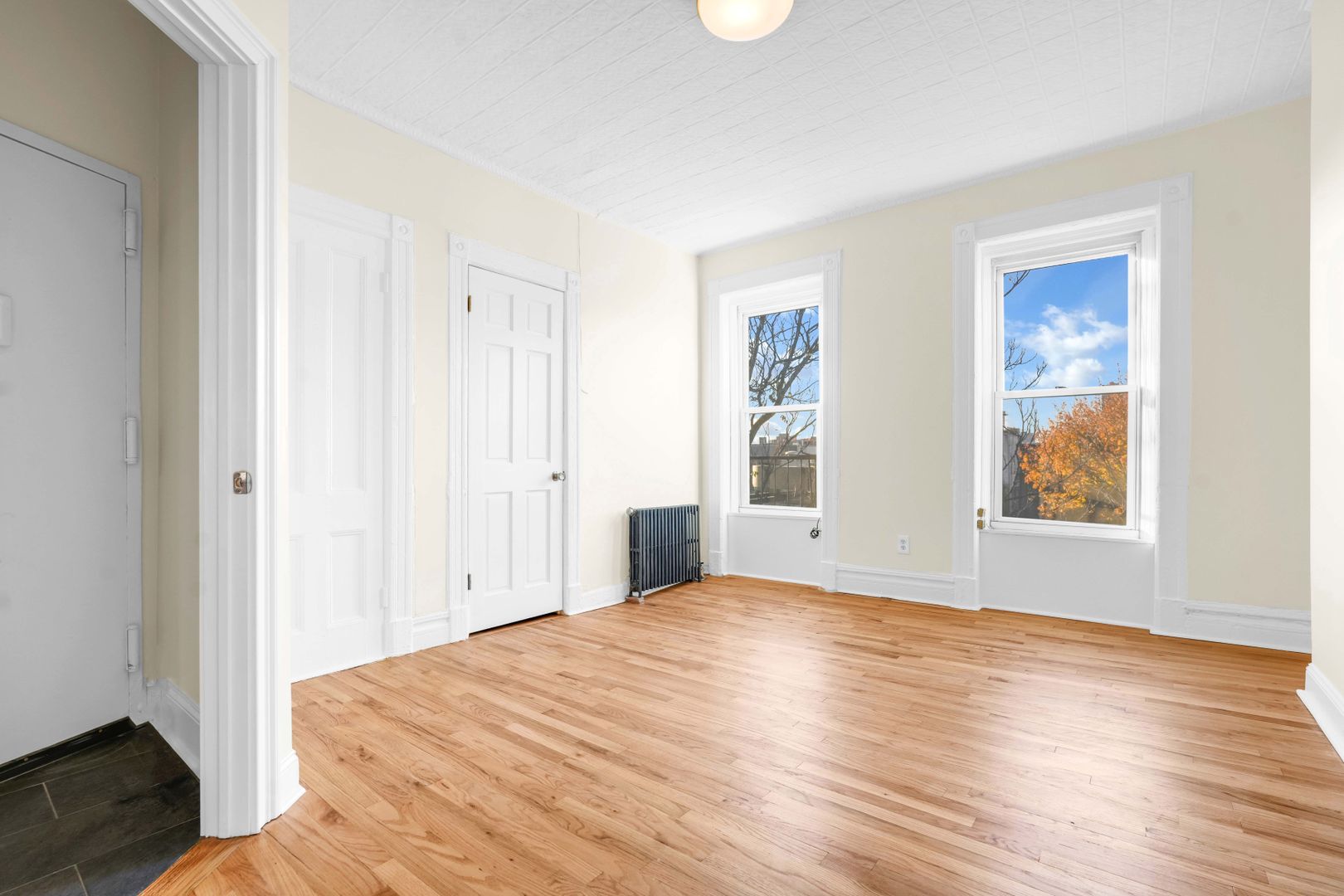 This light-filled, loft-like space is full of possibility. The two bedrooms are at opposite ends of the apartment, each equal in size and capable of accommodating a queen-size bed. Beautiful details include brick wall, high ceiling, large open kitchen/living area.