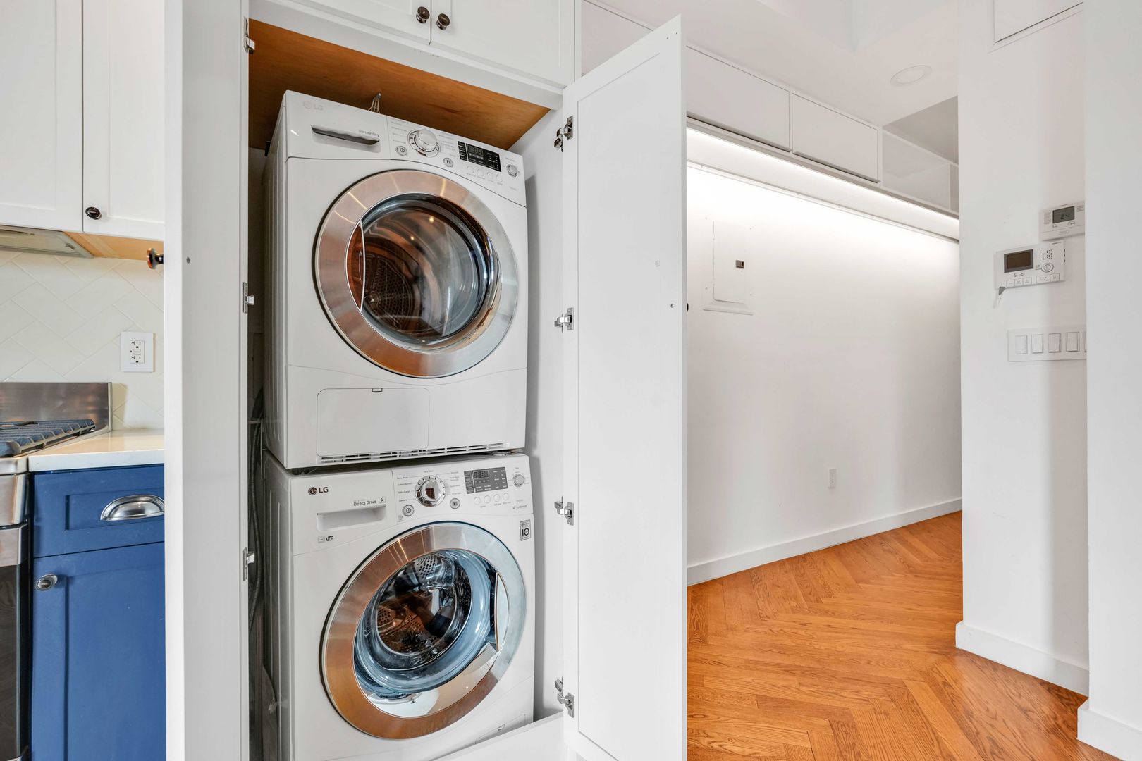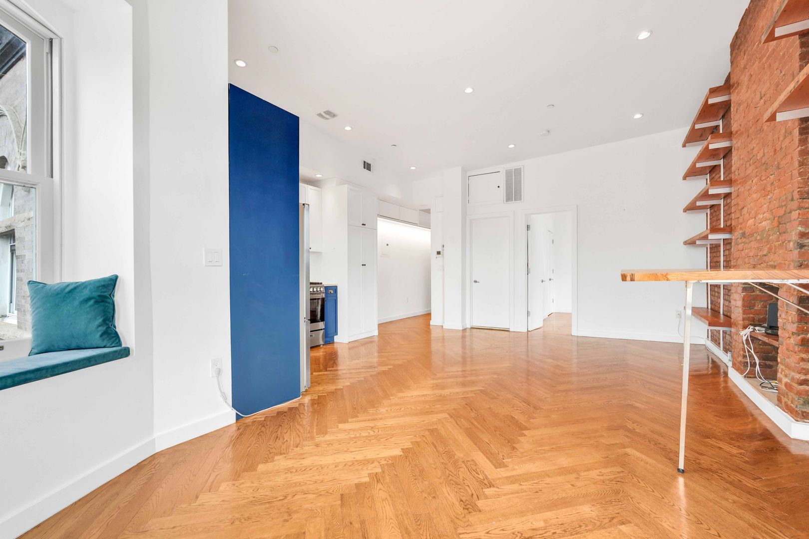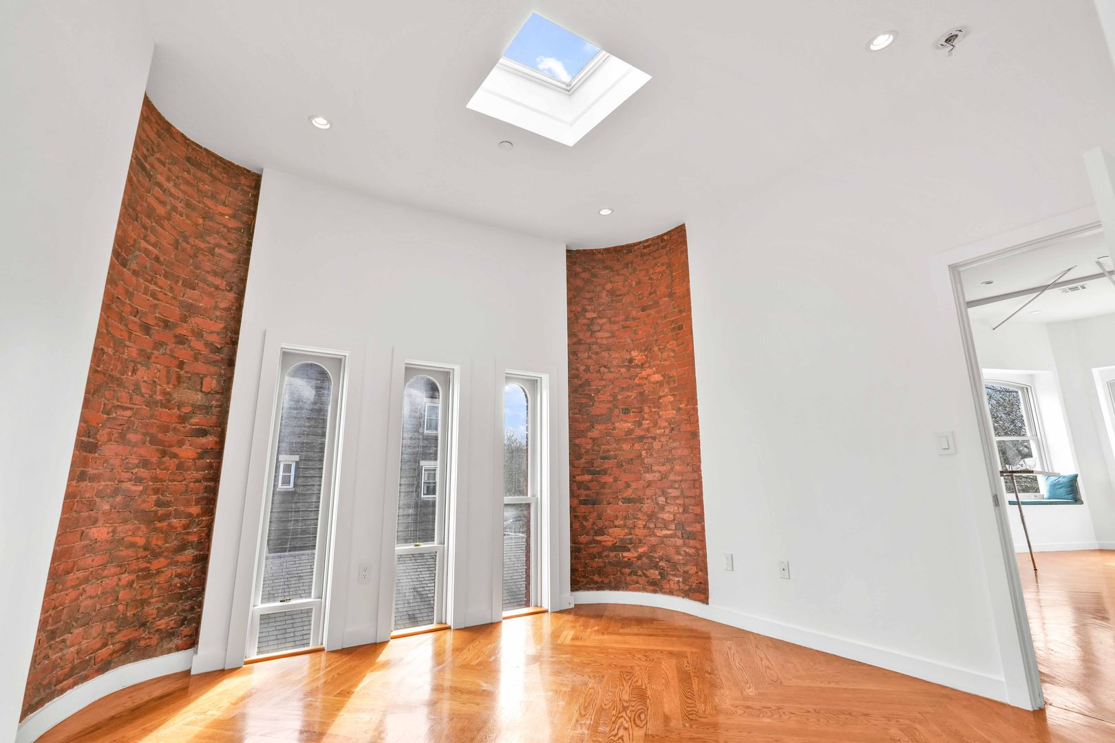 This top-floor, sun-drenched, corner oasis offers soaring 11+ foot-high ceilings, white oak herringbone floors, a large, open living and dining area with three large, curved south-facing bay windows with custom seating, a custom wall-mounted, foldable zebrawood dining table, a Douglas Fir library wall, original exposed brick walls, original beams, and a decorative fireplace. Multiple exposures and skylights provide an abundance of natural light in every room. A gorgeous open kitchen features an original, restored stained-glass window, white-and-blue custom Shaker-style cabinetry accented with oil-rubbed bronze hardware, white Caesarstone countertops, and high-quality stainless-steel appliances, including a gas range, vent hood, dishwasher, and in-unit LG washer and dryer.
