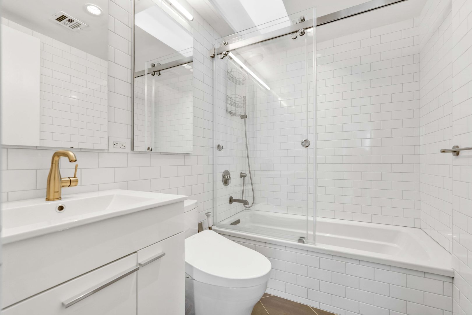 The bedroom features a skylight, unique windows, exposed brick, and a spacious closet. The newly renovated bathroom includes a skylight, a deep-soaking tub, a Toto toilet with a bidet, wall-to-wall beveled white subway tiles, a custom marble-top vanity, and tiled floors with radiant heating. There is another large closet and an additional upper cabinet for deep storage in the front hallway. The unit has central A/C and heating, and the building has an Intercom and Virtual Doorman system.